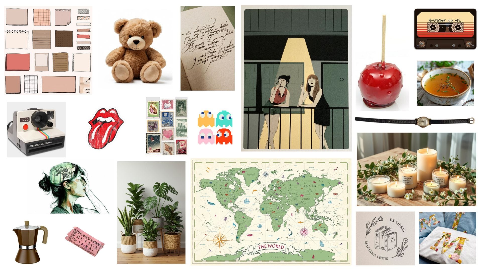Cómo veréis en mi mood board, recojo un conjunto de elementos que para mí están de alguna forma relacionados con el recuerdo. Algunos son universales y creo que resuenan con todos nosotros: un juguete que te acerca a tu infancia, un dulce que evoca el placer, el cuidado del caldo de tu madre o tu abuela, la letra manuscrita de alguien querido y que ahora está lejos.